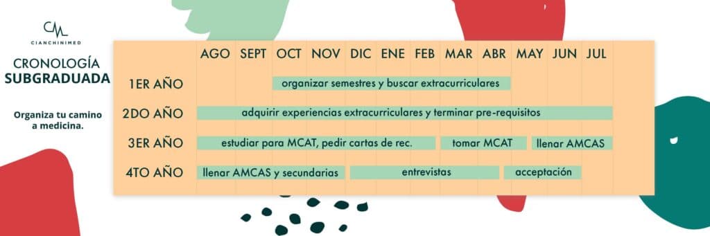 Sin embargo, la aplicación a escuela de Medicina conlleva unos requisitos que debes llevar a cabo los años anteriores, por lo que he preparado una cronología que ayuda a les estudiantes en universidad a organizarse.